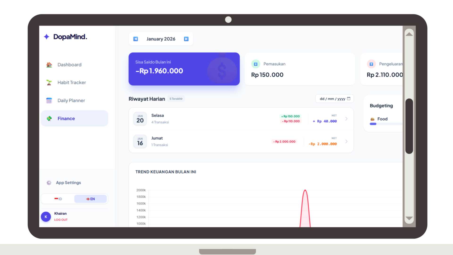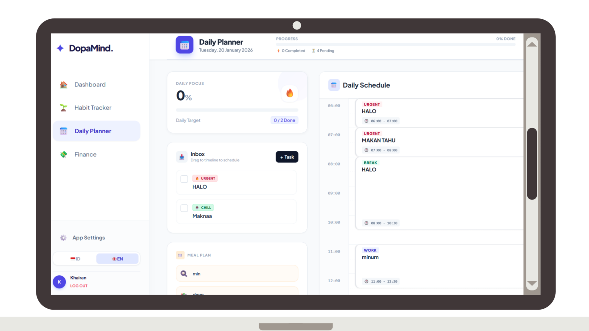 Project Overview: DopaMind is a comprehensive personal growth ecosystem designed to eliminate “app switching fatigue.” By unifying finance tracking, atomic habits, and daily planning into a single “Modern Monolith,” it provides users with a cohesive workspace to manage their lives and maintain long-term focus.