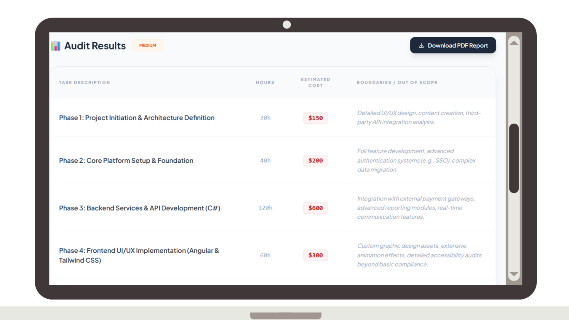 A sophisticated auditing platform that reduces project planning time by up to 60%. By leveraging AI, EstimateScopeAI delivers higher estimation accuracy, minimizes the risk of under-budgeting, and provides full transparency for both development teams and clients in understanding the technical scope of any application.