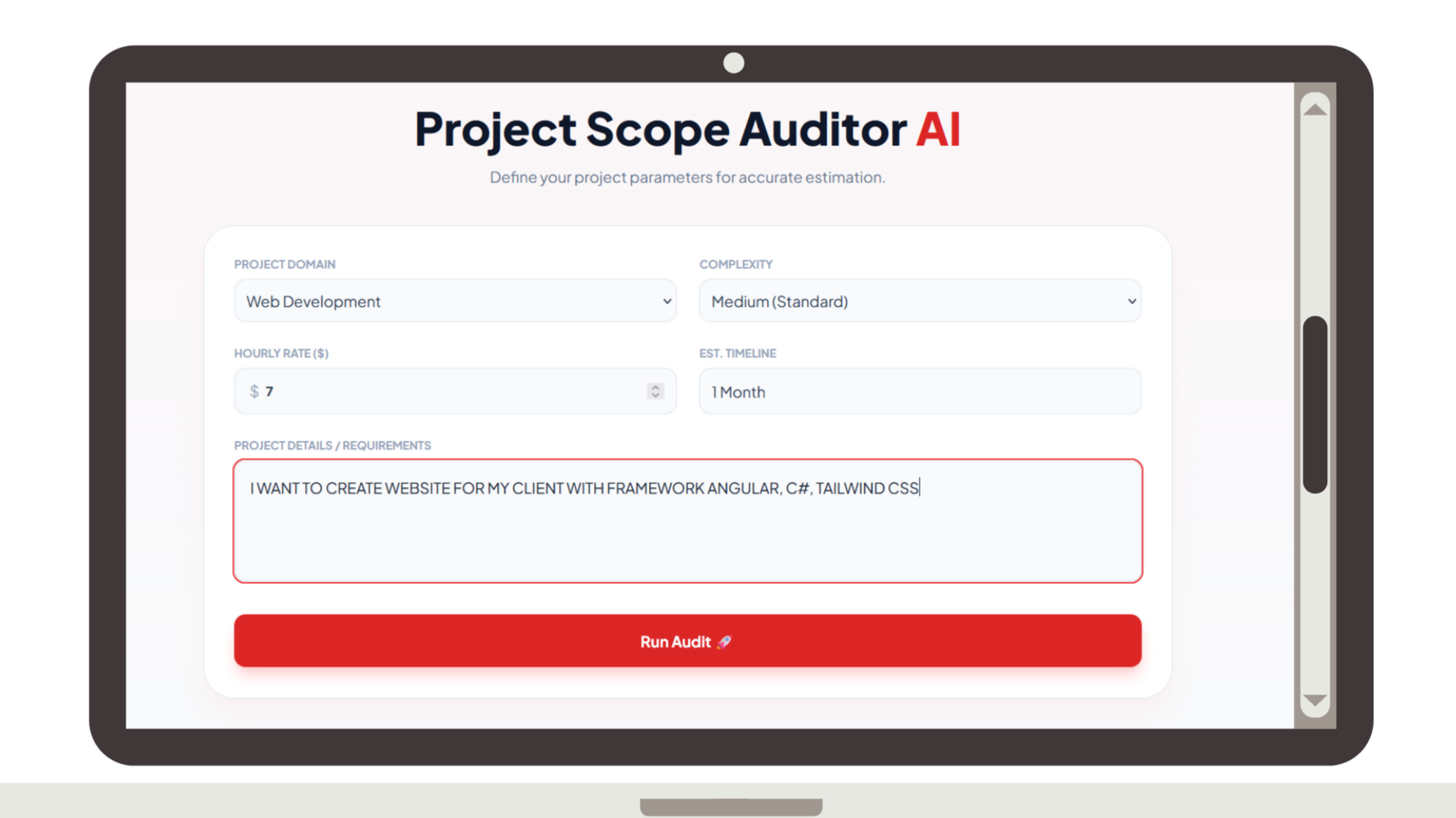 Project Overview: EstimateScopeAI adalah alat audit proyek tingkat enterprise yang dirancang untuk membantu tim manajemen menghitung estimasi biaya dan waktu pengembangan secara akurat. Dengan integrasi AI, aplikasi ini mampu menganalisis kompleksitas fitur dan memberikan cakupan proyek yang presisi.